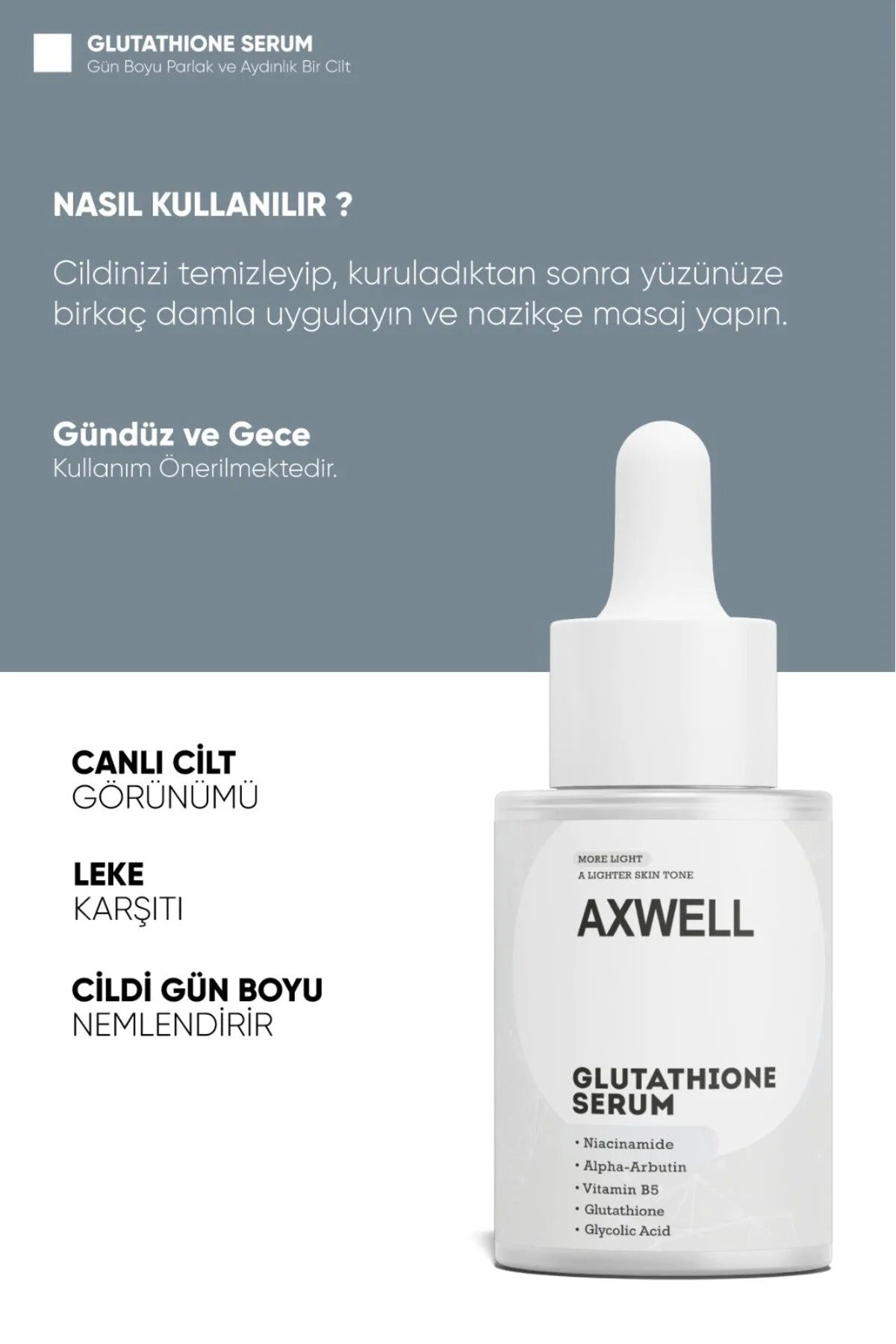 Axwell Glutatyon Serum, cildinize doğal bir aydınlık kazandırmak ve yaşlanma belirtilerini azaltmak için özel olarak geliştirilmiş güçlü bir formüle sahiptir. Glutatyon, cildinizi serbest radikallere karşı korurken renk tonunu eşitler, koyu leke ve pigmentasyon görünümünü azaltır. Günlük kullanım için uygun olan bu serum, cildinize canlılık ve gençlik kazandırır.